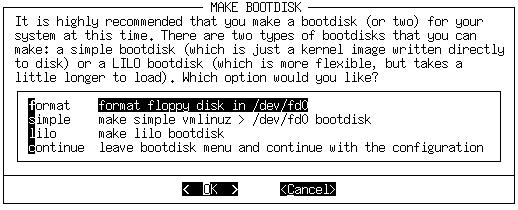 Making a boot disk for future use is probably a good idea. You will have the option of formatting a floppy and then creating one of two types of boot disk. The first type, simple, simply (go figure) writes a kernel to the floppy. A more flexible (and highly recommended) option is lilo, which will of course create a lilo boot disk. See the section called LILO in Chapter 7 for information on lilo. Of course, you may also choose to simply continue, in which case no boot disk will be made.