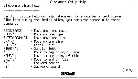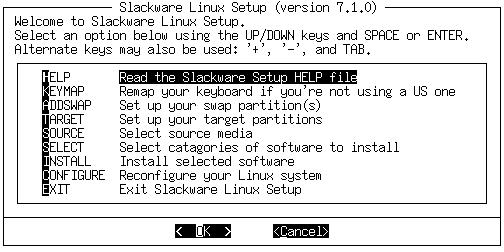 If this is your first time installing Slackware, you might want to take a look at the help screen. It will give a description of each part of setup (much like the one we're writing now, but less involved) and instructions for navigating the rest of the install.