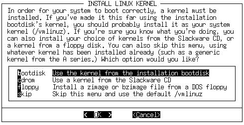 Here you will be asked to select a kernel to install. You can install the kernel from the boot disk you used to install, the Slackware CD-ROM, or from another floppy which you (always thinking ahead) have prepared. Or you can elect to skip, in which case the default kernel will be installed and play will continue to the dealer's left.