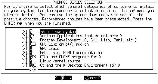 The select option allows you to select the software series that you wish to install. These series are described in the section called The Software Series. Please note that you must install the A series to have a working base system. All other series are optional.