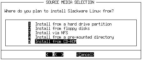 The source section is where you select the source media from which you are installing Slackware. Currently there are four sources to choose from. These are floppy, CD-ROM, NFS, or a premounted directory.