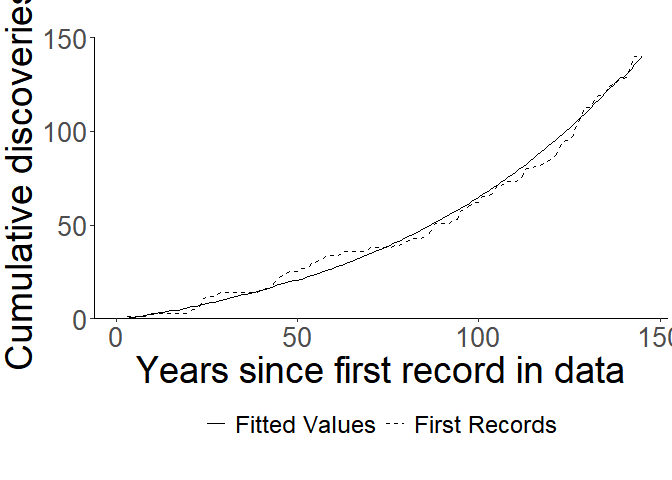 For the most basic demonstration, let’s look at the data provided in Solow and Costello (2004) which describes discoveries of introduced species in the San Francisco estuary (California, USA) between the years 1850–1995. We’ll plot it in a cumulative form, replicating the plot from Solow and Costello (2004):