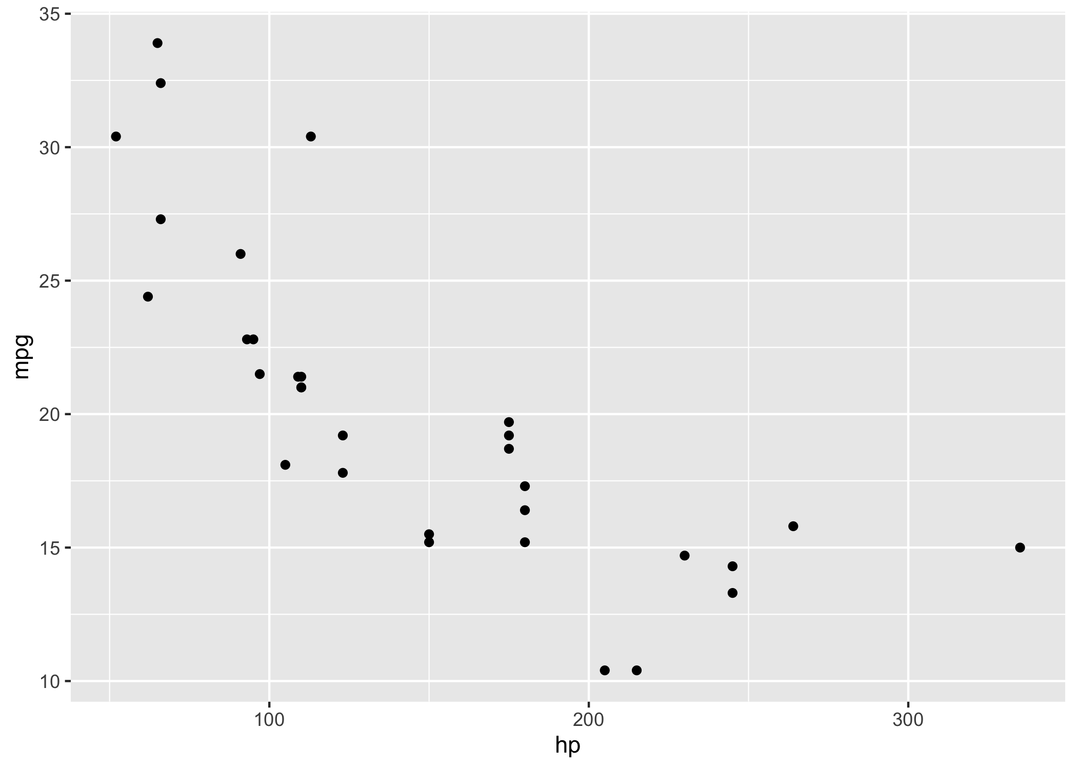 ggplot2::ggplot(mtcars, ggplot2::aes(x = hp, y = mpg)) +