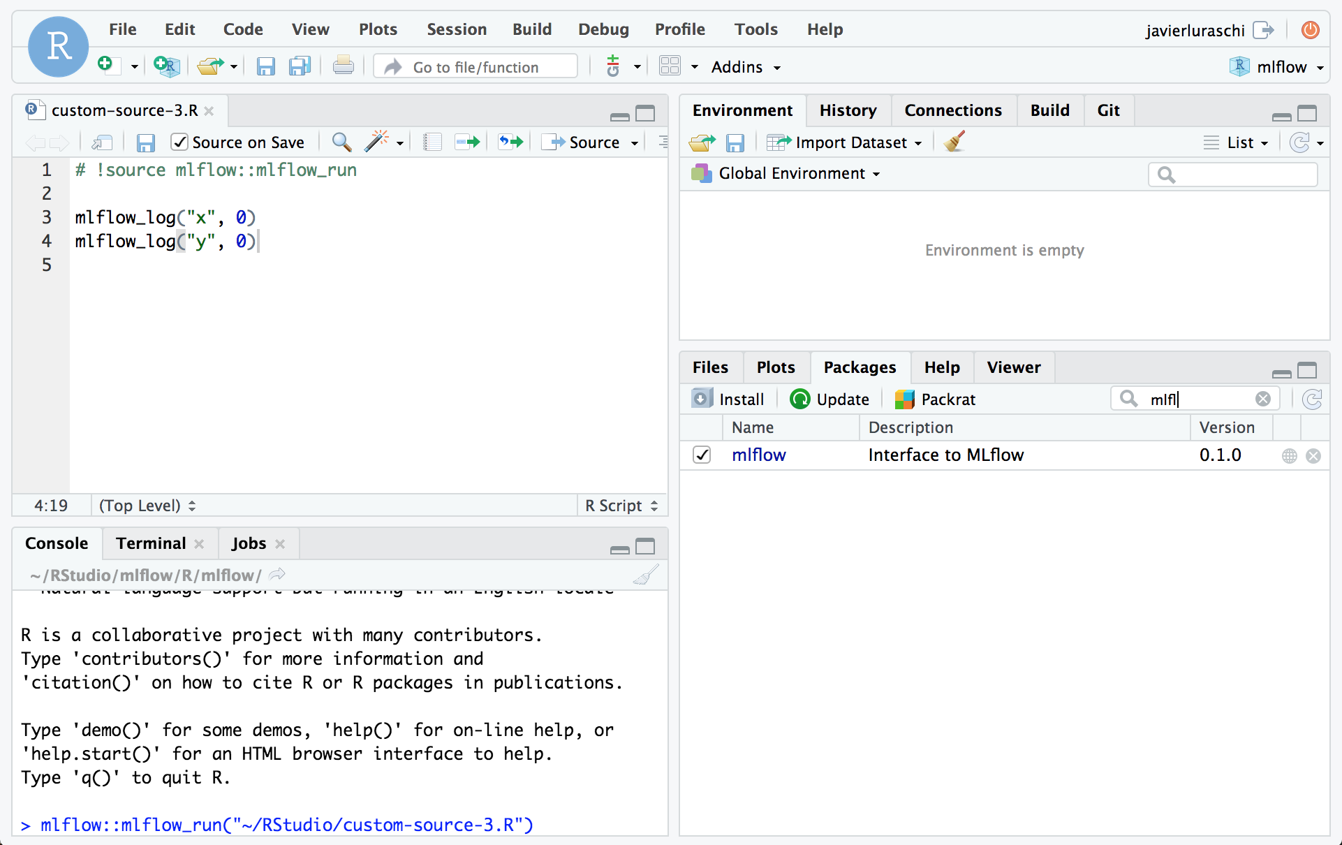 MLflow projects can be explicitly created or implicitly used by running R with mlflow from the terminal as follows: