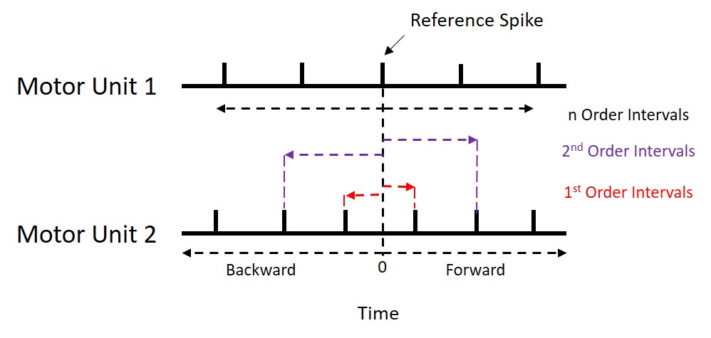 recurrence_intervals() calculates the recurrence intervals based on how many recurrence interval orders is specified (see image below). Specifically, they are calculated as the timing difference between a discharge event in one (reference) motor unit and the nearest forward and nearest backward discharge events in another (event) motor unit. The motor unit used as the reference unit is the unit with fewer discharges. Order refers to how many discharges before and after we are including in our calculations. Default settings are for first order recurrence intervals as previous research has shown that false peaks are likely to appear with higher orders.