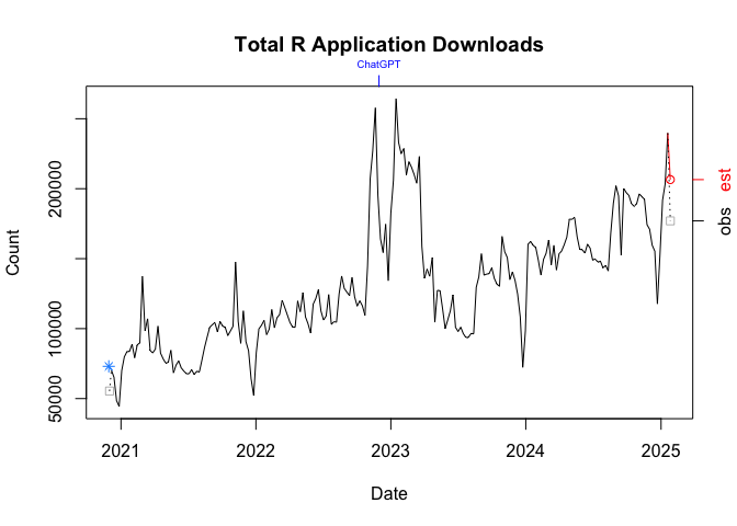 by cranlogs::cran_downloads(packages = "R"), is, with two