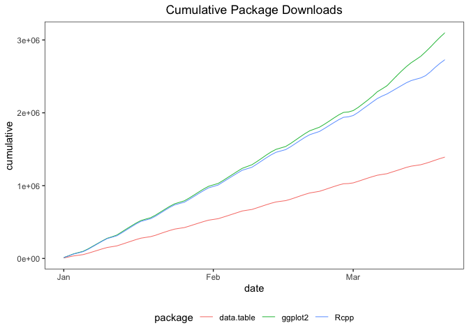 cranDownloads(packages = "ggplot2")> date count cumulative package