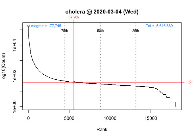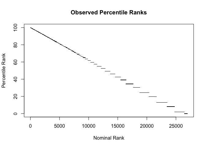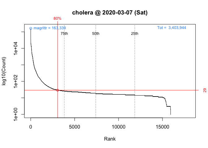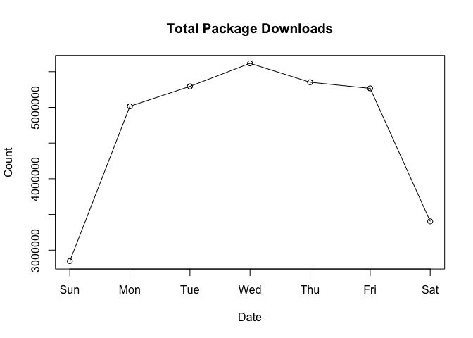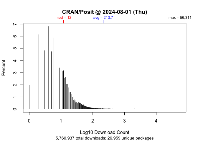 queryRank(1:7)The summary method provides the number of unique packages downloaded, the total number of downloads and the five number summary (plus the arithmetic mean):
