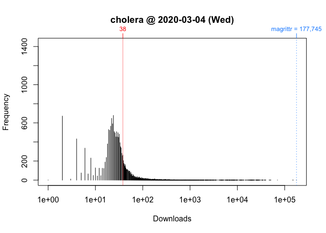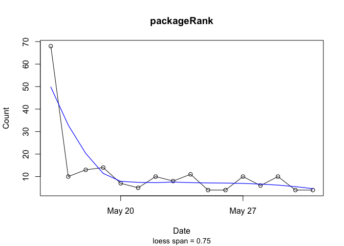 print(cranDistribution(), top.n = 7)Alternatively, you can use queryRank():