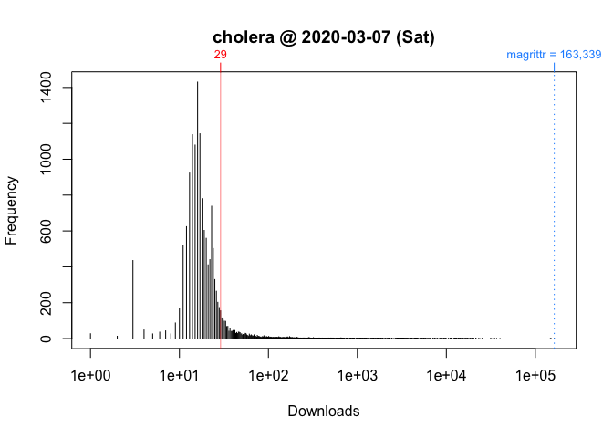 cranDownloads(packages = "HistData", from = "2020-02", to = "2020-02")Let’s say you want the download counts for ‘rstan’ for 2020.