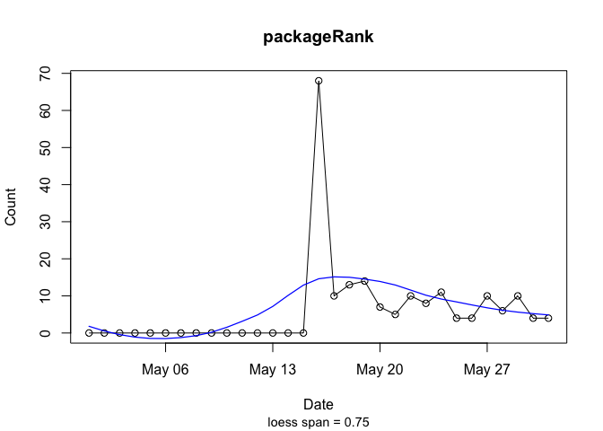 cranDownloads("packageRank", from = "2019-05-10", to = "2019-05-16", pro.mode = TRUE)