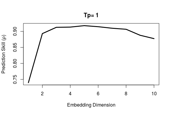 First, we use EmbedDimension() to determine the optimal embedding dimension, E: