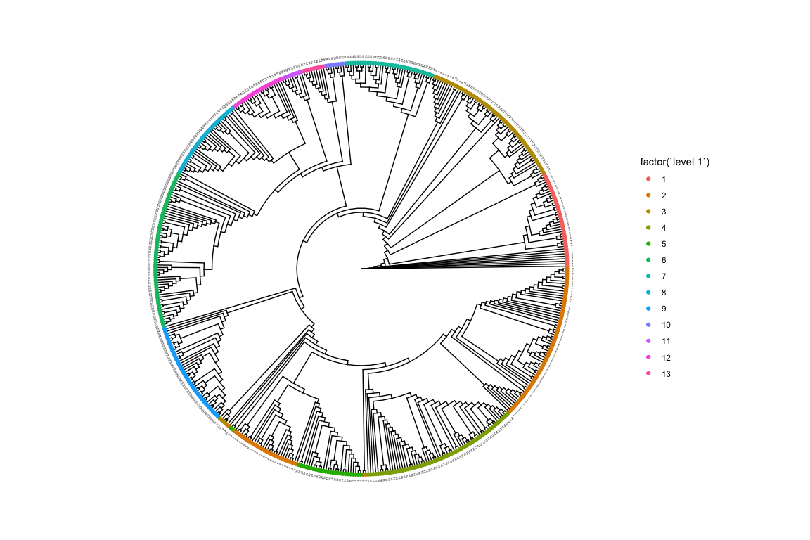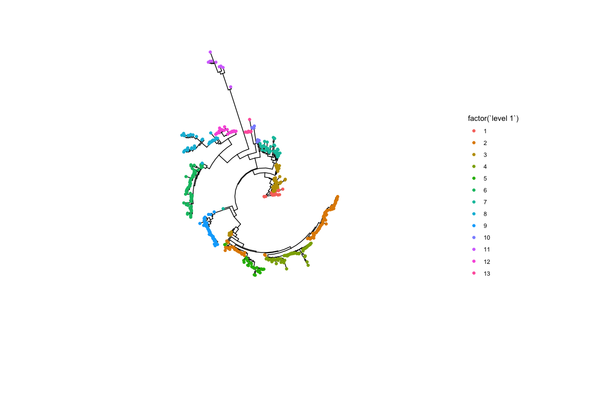 gg <- gg + geom_tippoint(aes(color = factor(`level 1`)))