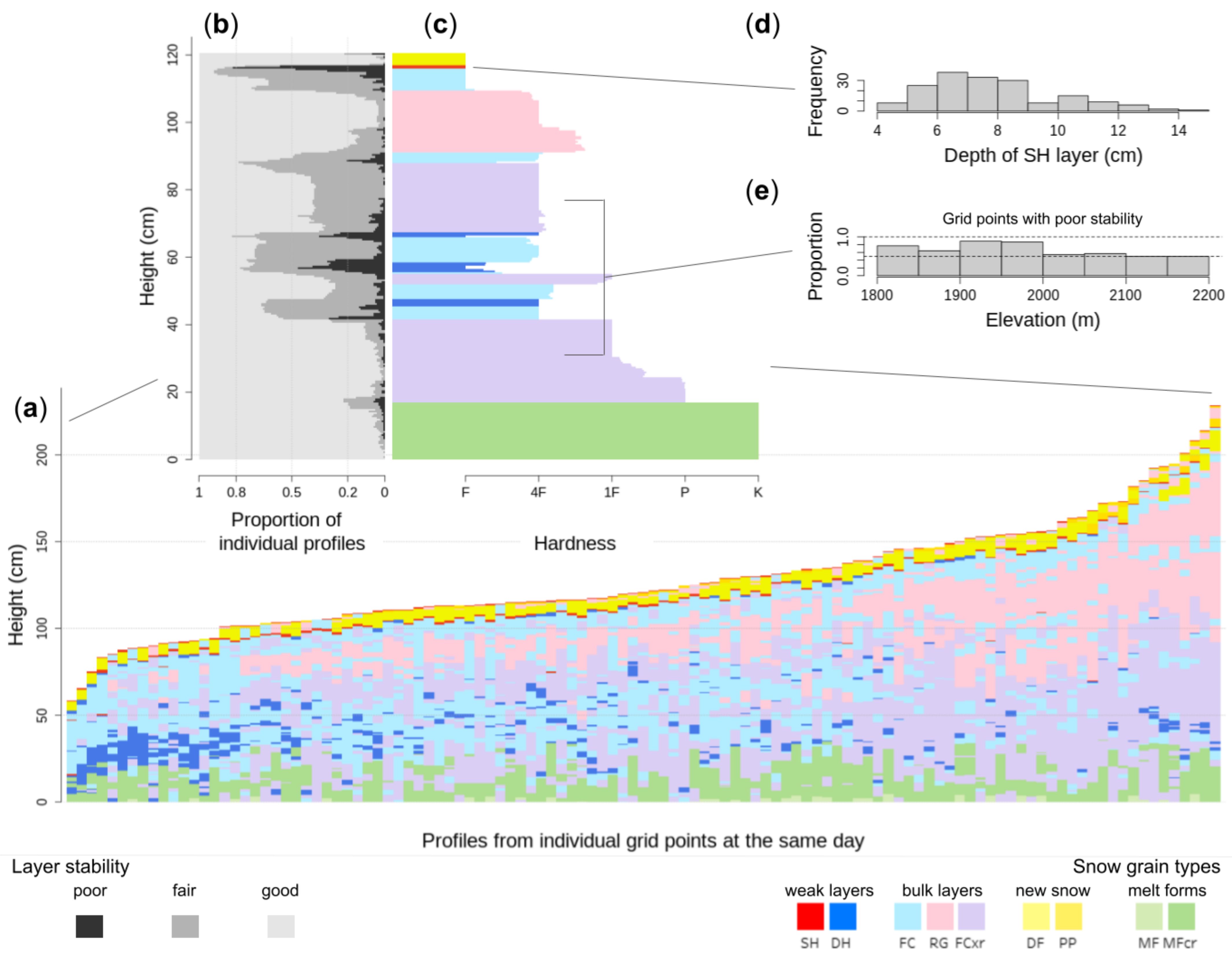 The figure shows (a) a snow profile set from an avalanche forecast region with 112 simulated profiles from the same day, (c) which is summarized by the average profile. The average profile provides access to distributions of layer and profile properties, such as e.g. (b) the distribution of layer stabilities derived from threshold sums, (d) the depth distribution of a SH layer that is starting to get buried, (e) the elevation distribution of the proportion of profiles that contain layers with poor stability in mid snowpack.
