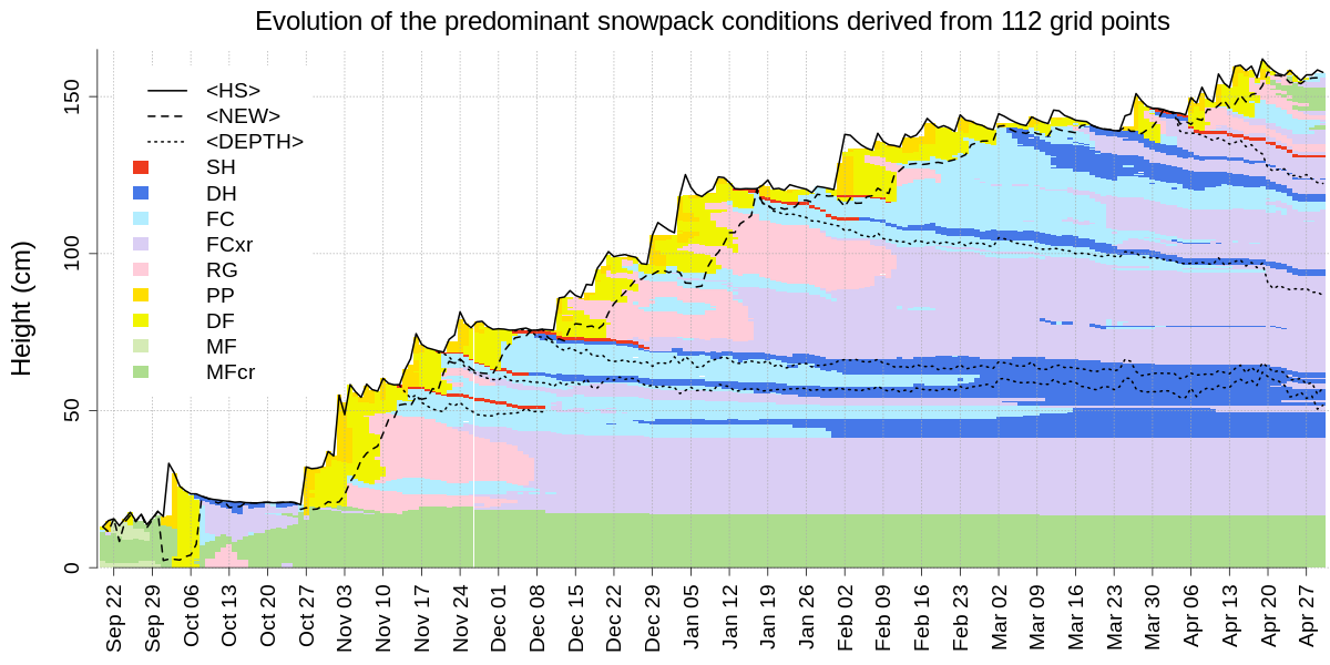 grain types). The algorithm captures the median total snow height (solid