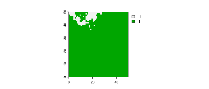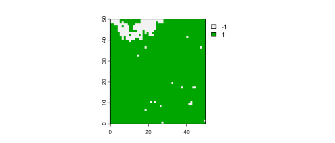 Most of the raster area is covered with the value of 1, and just about 5% of the area is covered with the value of -1. The main function in this package is kinetic_ising(). It accepts the input raster and at least two additional parameters: B – representing external pressure and J – representing the strength of the local autocorrelation tendency. The output is a raster modified based on the provided parameters.