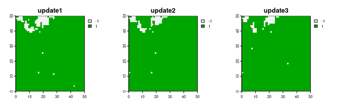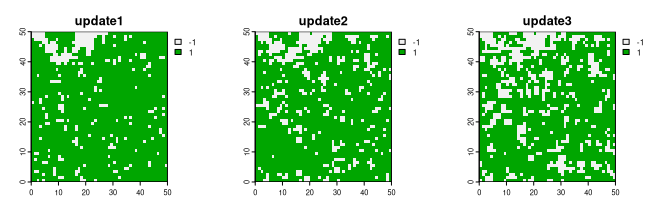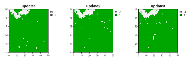 The kinetic_ising() function also has a fourth argument called updates. By default, it equals to 1, returning just one raster as the output. However, when given a value larger than one, it returns many rasters. Each new raster is the next iteration of the Ising model of the previous one.