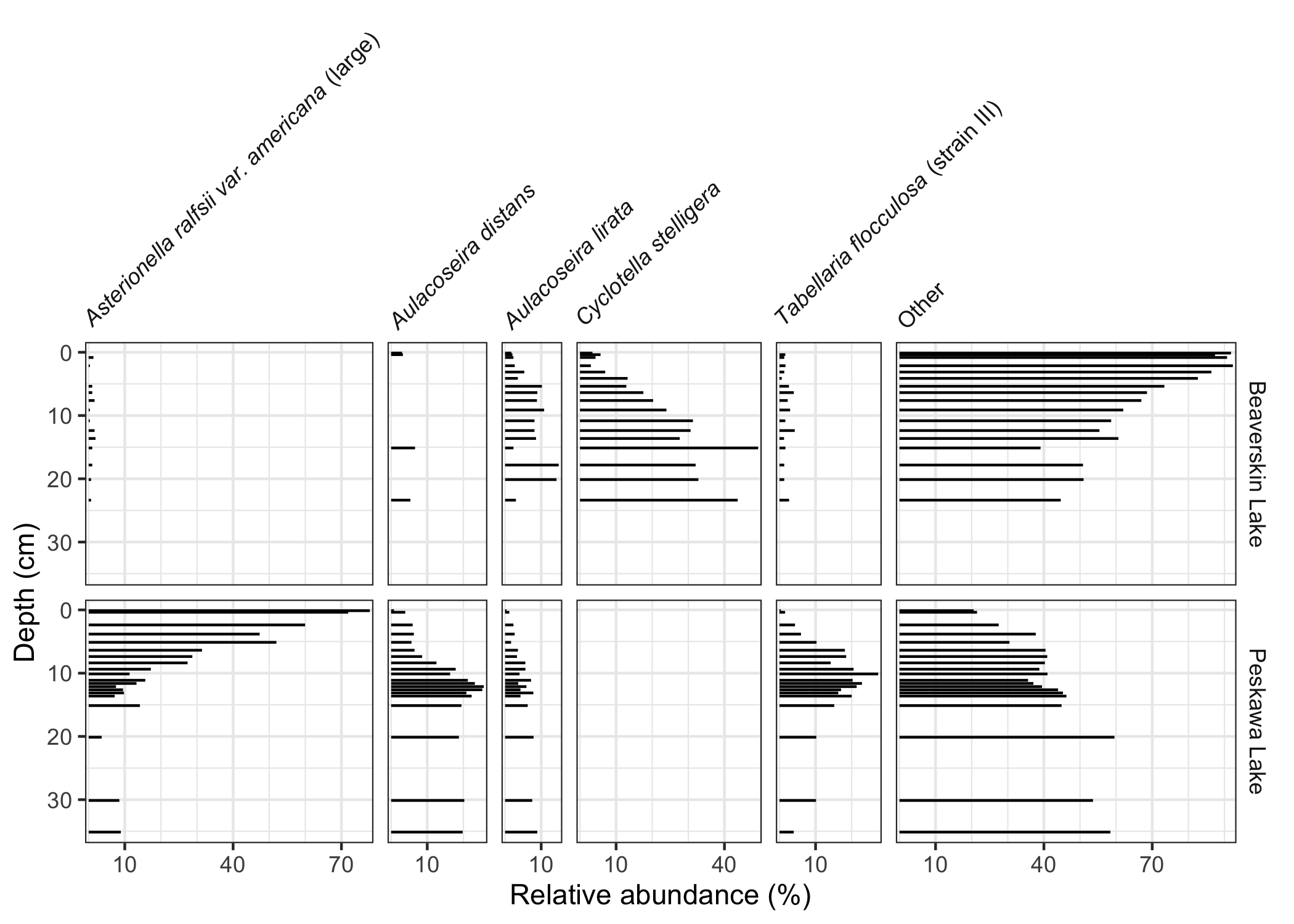 ggplot(keji_lakes_plottable, aes(x = rel_abund, y = depth)) +
