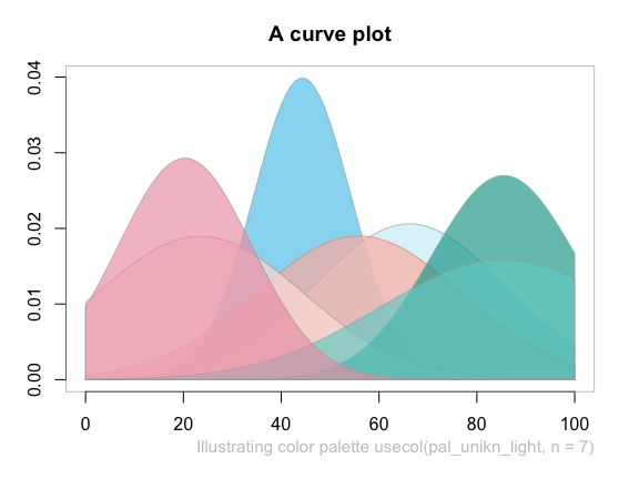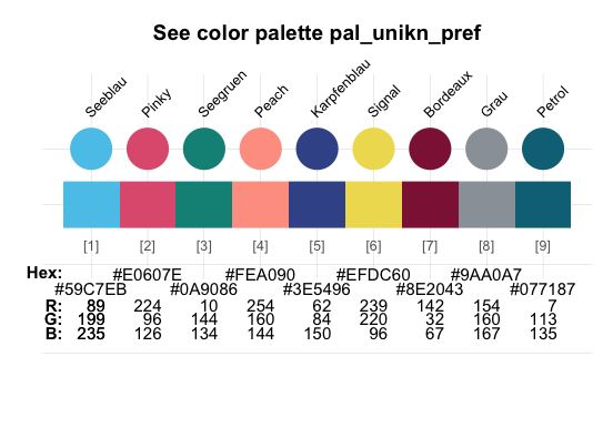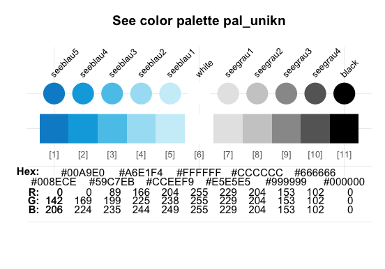 A shorter version (with 10 colors) and an alternative (with more muted colors for PowerPoint presentations) are provided as pal_unikn_web and pal_unikn_ppt, respectively. (Inspect seecol("unikn_basic") or see the corporate design specifications for details.)