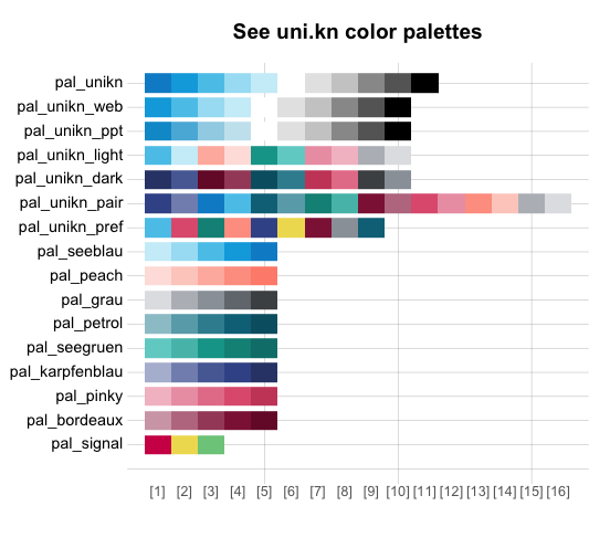 Originally, the unikn package primarily provided the 16 color palettes of the University of Konstanz: