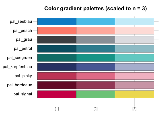 main = "Color gradient palettes (scaled to n = 3)")