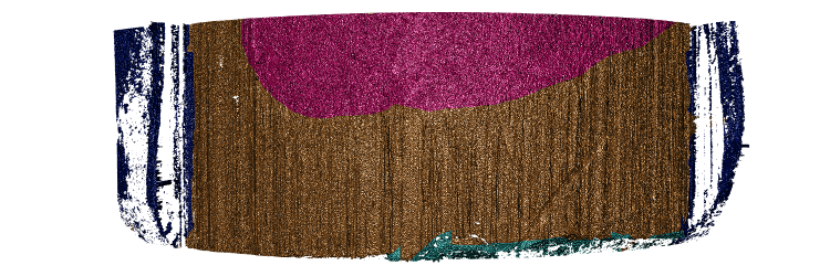 Below is a 3d surface of a part of a bullet surface is shown. Some regions are marked up: the bronze colored area is an area with strong striae (vertical lines engraved on the bullet as it moves through the barrel of the handgun when fired), areas in dark blue show groove engraved areas, the light blue area shows break off at the bottom of the bullet, and the pink area marks an area without striae: