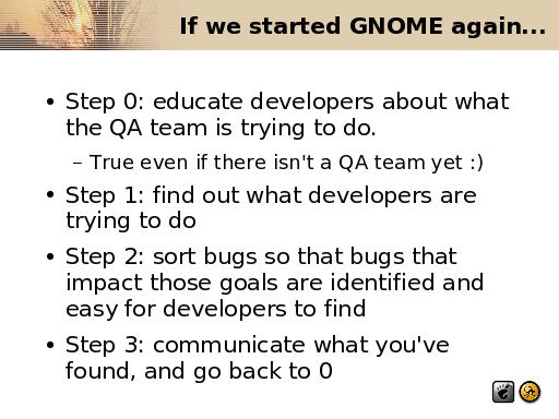 Step 0: 'we're not trying to step on your toes, we're trying to help you out, let us know what you think we can do.' This is a huge difference from proprietary software QA- Jim said last night 'QA has all the power.' It turns out that if free software hackers don't like you, you have 0 power.